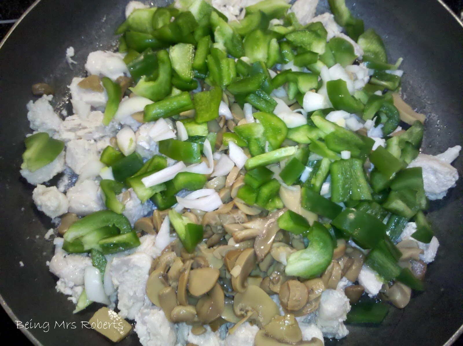 (Here I cheated and used only green pepper and regular sweet onions since they were all I had on hand. I also added them to the skillet after I cooked the chicken)