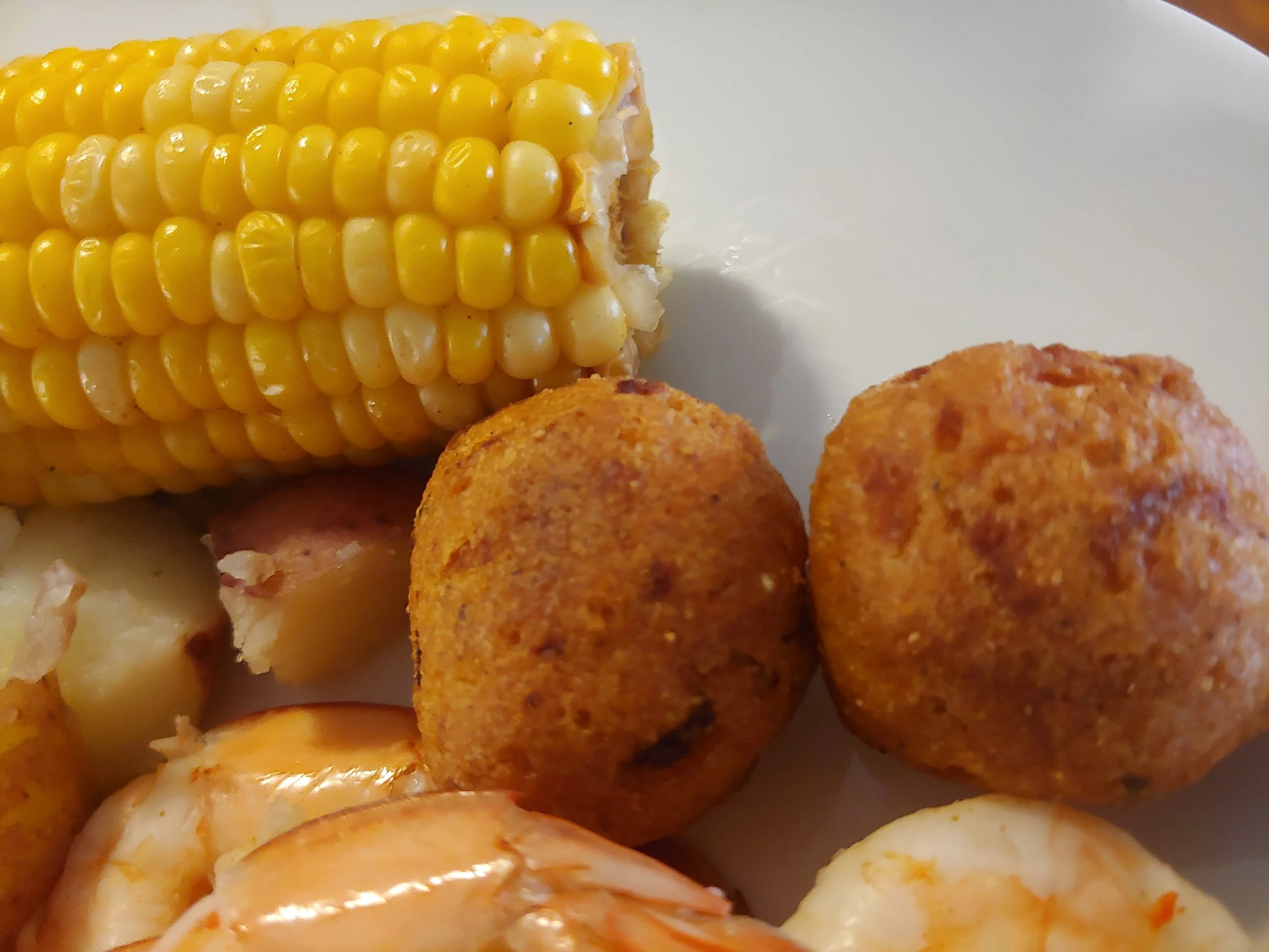 Serve in a large pot or just dump everything on the table (with a plastic tablecloth) At the end of the night we just scoop up the tablecloth and throw everything away. Serve with hush puppies or some cheddar biscuits.